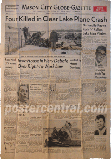 Fifty-one years ago today, in Clear Lake, Iowa, rock and roll lost three of its pioneering artists in a plane crash. Perishing in a cornfield in the dead of winter were Texan Buddy Holly, Californian Ritchie Valens and DJ J.P. "The Big Bopper" Richardson, along with pilot Roger Peterson. All three singers were riding the crest of a wave of music popularity.